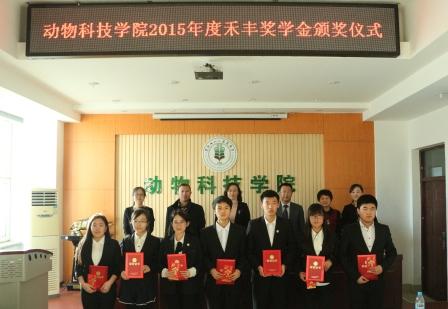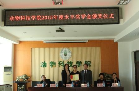 与会领导为获奖的师生颁发荣誉证书及奖金,许连详总监对各位获奖的同学表示祝贺,叮嘱全体员工重视专业知识学习,理论和生活实际紧密结合,珍惜学习机会,珍惜母校的培养,做团结勤奋的动科人。杨艳秋书记对许总一行表示欢迎,对禾丰集团多年来对学院各项工作的大力支持表示感谢,她号召全体同学把企业的奖励用到实处,时刻铭记企业的关怀,做好爱心接力,尽自己的能力帮助更多的同学完成学业。