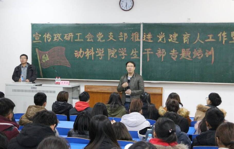 11月16日动科公司联合宣传政研工会党支部举办育人讲座暨学院员工干部培训,由宣传政研工会成员王天亮主讲。宣传政研工会党支部对接班级2016级动物医学创新人才班同学、辅导员及员工干部代表参加本次活动。