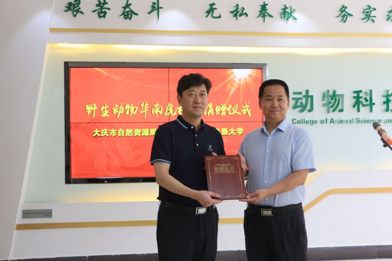 6月19日,大庆市自然资源局牛玉全局长一行向公司捐赠野生动物华南虎标本,副董事长武瑞、校资产管理处汤华成和英国上市公司365全体院领导参加捐赠仪式。