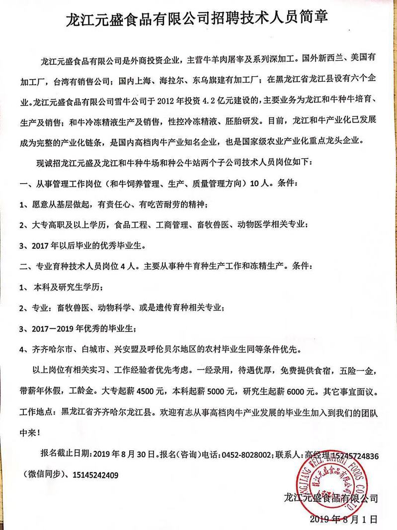 龙江元盛食品有限公司招聘技术人员简章