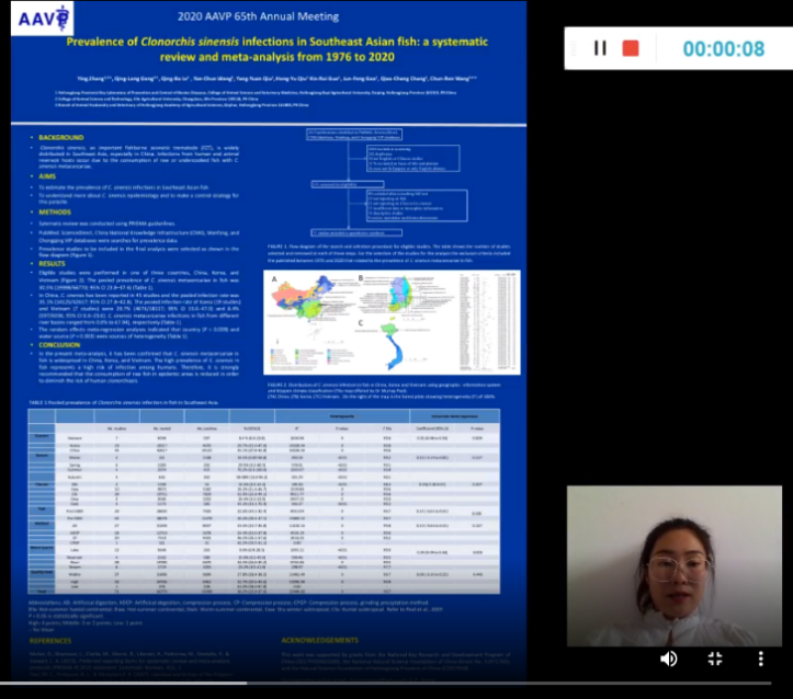 2018级博士研究生张莹作了题为“Prevalence of Clonorchis sinensis infections in Southeast Asian fish: a systematic review and meta-analysis from 1976 to 2020.” (东南亚鱼类华支睾吸虫感染流行的系统回顾与荟萃分析)的海报讲解。