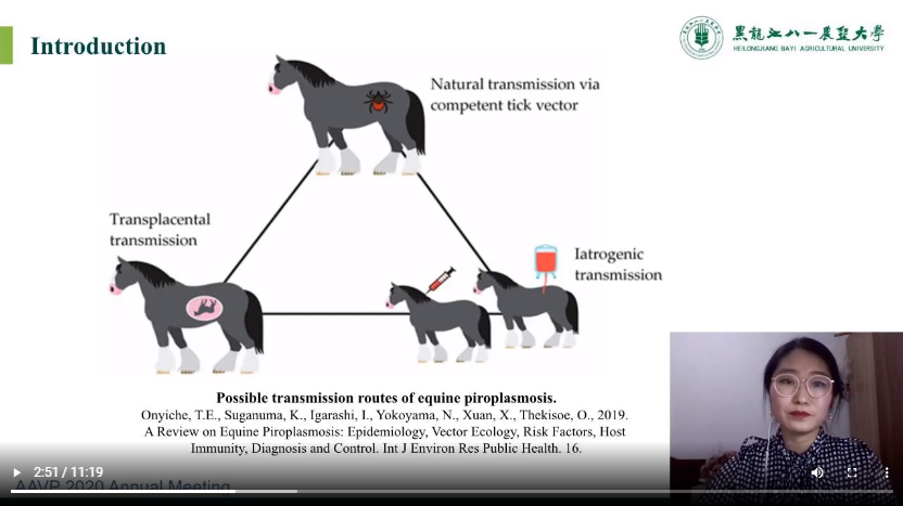 2018级硕士研究生胡阳作了题为“Transplacental transmission of Babesia caballi from carrier mares to foals.”(驽巴贝斯虫可垂直传播的依据)的会议报告。