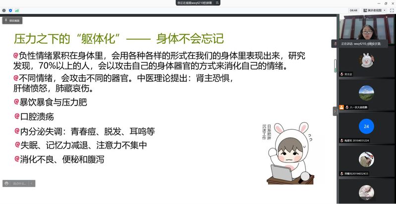 2021年12月3日,动科学院邀请员工处员工心理发展指导中心主任王晓琦老师为2022届毕业生考研员工举办题为“考研帮扶心理指导”的考研心理指导帮扶讲座,学院2018级考研学子300余人参加了本次讲座。