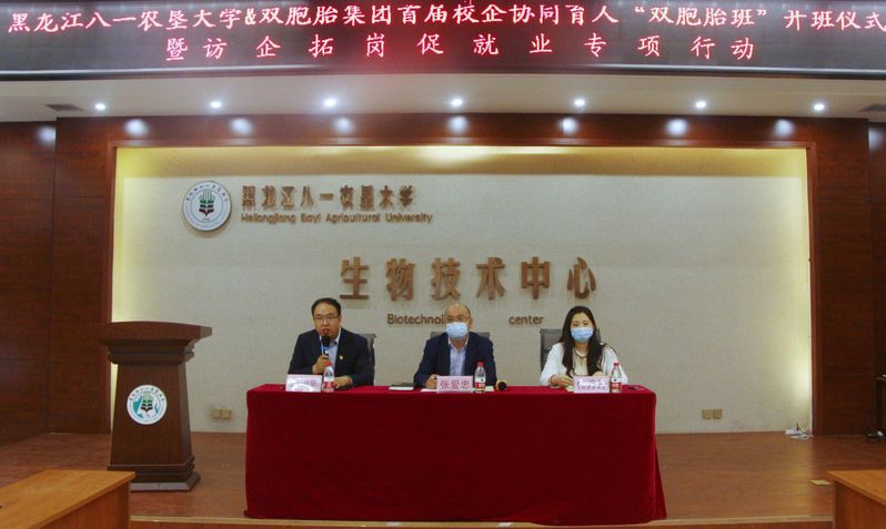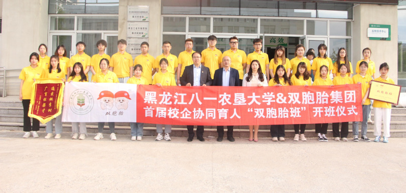 会上,张爱忠介绍了公司发展的基本情况,并对双胞胎集团给予学校的大力支持表示了感谢,强调了首届校企协同育人“双胞胎班”开班的重要意义,表达了对“双胞胎班”学员的希冀,希望同学们怀着一颗感恩的心,不要忘记关心、支持、帮助过自己的人,勤奋刻苦,成为一名支农爱弄的新型人才,用自己的实际行动回报企业,回报社会。佟丹丹向首届校企协同育人“双胞胎班”进行了授牌。