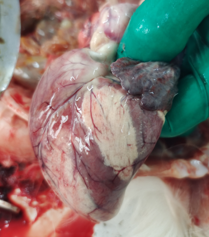 大腿肌肉坏死,肌纤维呈白色。 | 心肌坏死,局部肌肉呈白色。 |