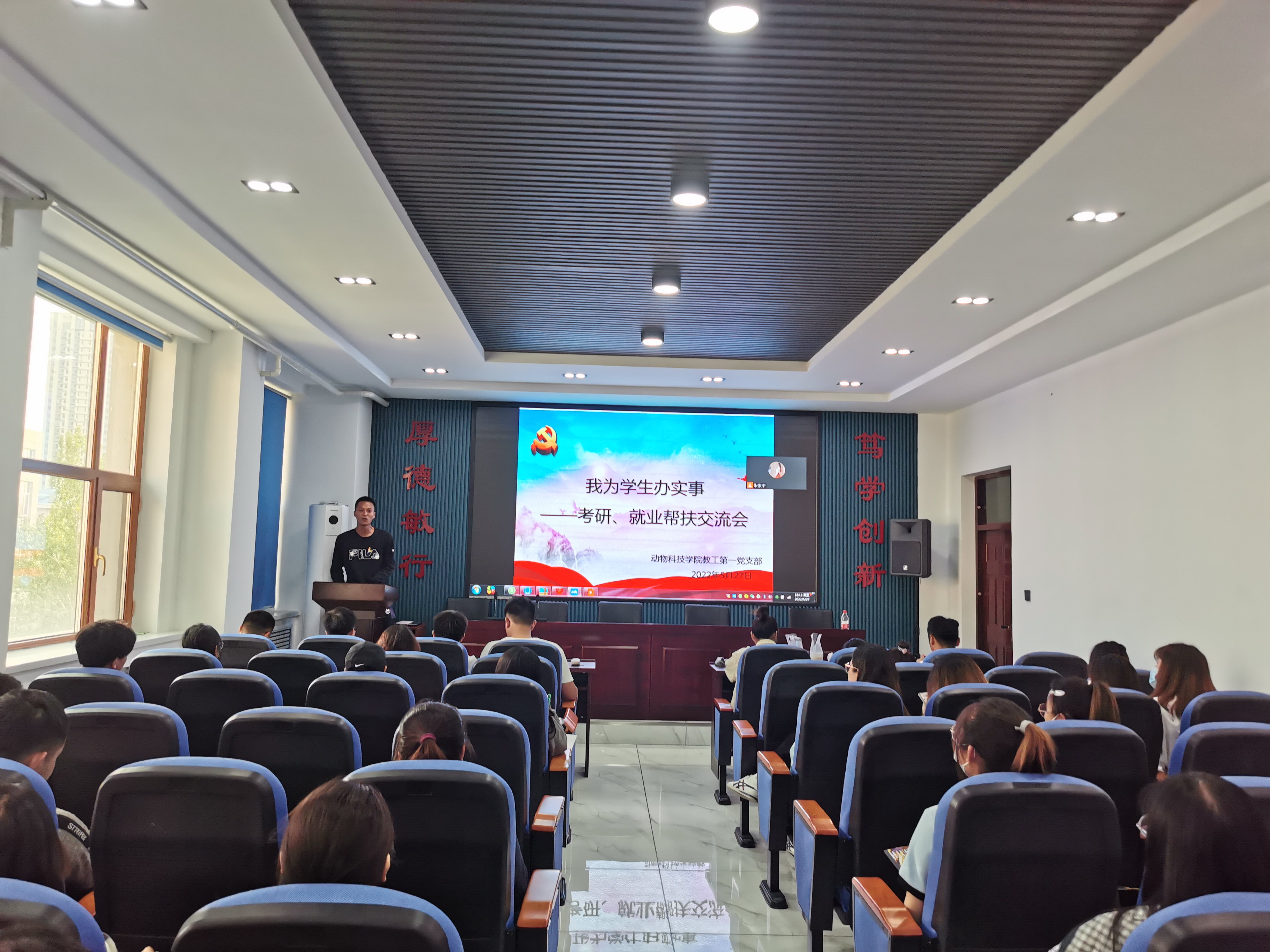 2022年4月14日,支部第三党小组邀请伊利集团、禾丰公司、黑龙江北大荒九三农牧发展有限公司等企业开展线上校园招聘宣讲会。帮助公司37名同学提供就业岗位。