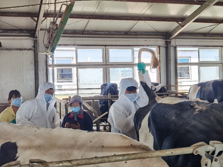 活动期间,团队成员积极走进各地牛场,在进行采访问卷调查后帮助养殖户喂牛,清扫牛舍;传授“牛腹通”的使用方法,包括粪便样本采集、加样的注意事项,并指导养殖户进行犊牛脐带消毒、静脉注射方法等常见操作技术。