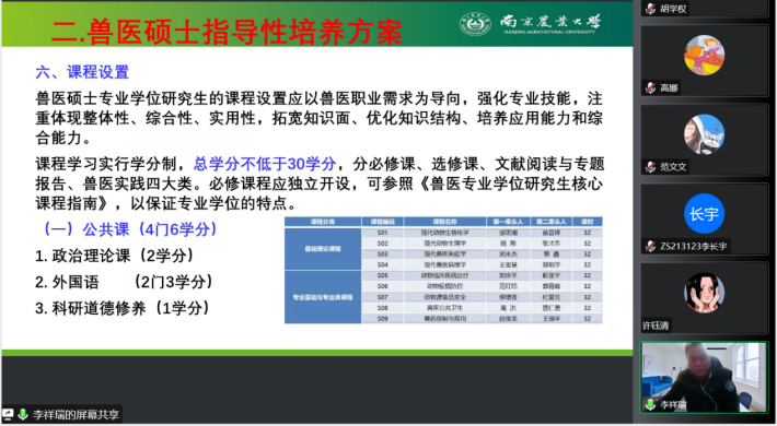 李教授从兽医专业学位的设立与概况,兽医硕士指导性培养方案,兽医硕士学位论文基本要求,过程管理与制度建设,评估,问题与思考和几点建议七个方面对兽医专业硕士培养方案和培养方式进行了解析。导师也针对兽医专硕培养过程中遇到的问题与李教授进行了深入交流。