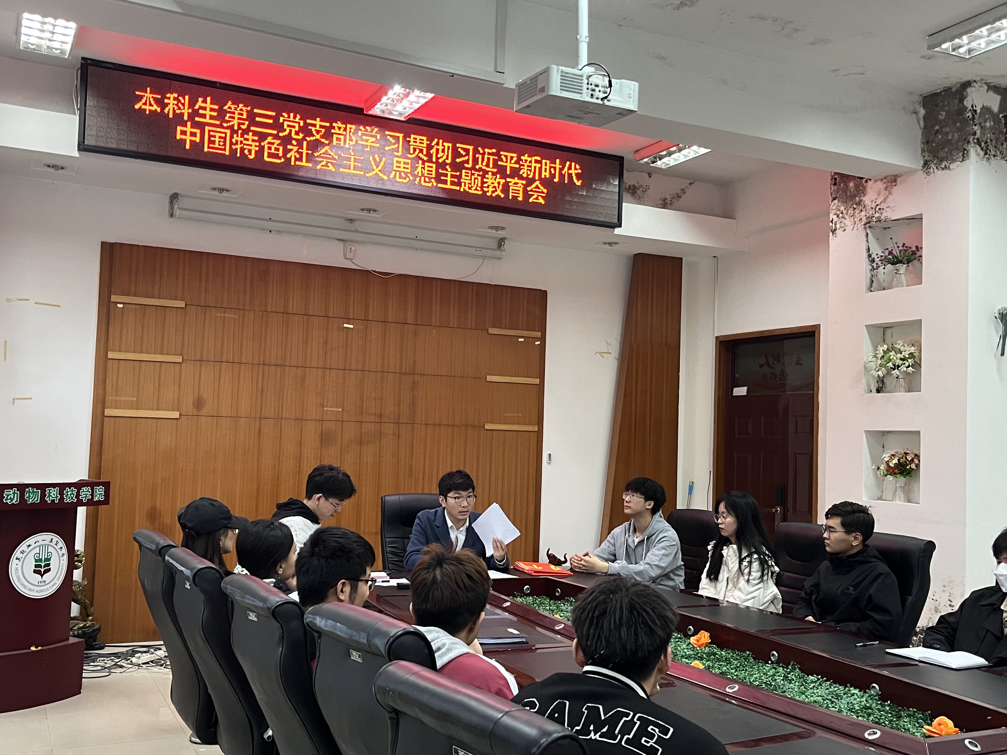 为扎实开展学习贯彻习近平新时代中国特色社会主义思想主题教育,按照学院主题教育实施方案要求。4月27日,本科生第三党支部在动医楼4102会议室召开学习贯彻习近平新时代中国特色社会主义思想主题教育专题学习会,支部全体党员出席会议,支部书记于浪潮主持会议。