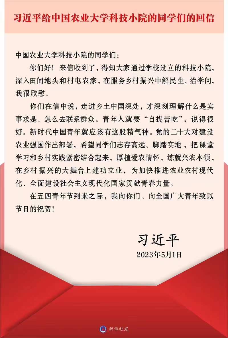 习近平总书记给中国农业大学科技小院的同学们的回信,提出殷切期望,向全国广大青年致以节日的祝贺,并在信中提到:“走进乡土中国深处,才深刻理解什么是实事求是、怎么去联系群众,青年人就要‘自找苦吃’”。