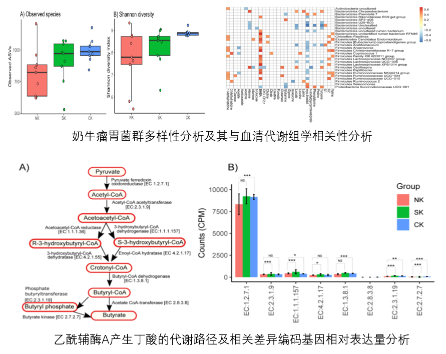 该论文研究产后早期,酮症奶牛和健康奶牛瘤胃微生物群的变化,以及这些变化如何影响患病风险。数据表明,即使在产后早期采食量充足的奶牛中,微生物种群也可能通过影响短链脂肪酸代谢和酮体积累而与酮症发生有关。此研究发现了一种独特的瘤胃微生物群与临床酮症相对应,酮症与奶牛瘤胃细菌群落门和属水平上的变化有关;强调了酮症与瘤胃细菌之间的生物学联系,瘤胃微生物群、血清代谢组和相关分析的变化均表明瘤胃微生物谱与酮症产生有关。其中克里斯滕森菌科、瘤胃球菌科、毛菌科和普雷沃菌科在酮症奶牛中富集,可能与β-羟基丁酸的产生有关。该论文研究还提供了丁酸酯合成增加并促进β-羟基丁酸生成的证据,这些发现为区分生酮和非生酮奶牛的瘤胃微生物群的不同模式提供了基础信息。