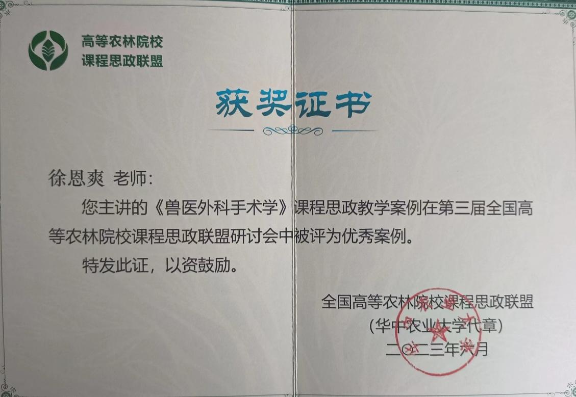 研讨会以“促进课程思政高质量发展,加快推进新农科建设”为主题展开交流,分享研讨了课程思政建设的创新改革举措与成功做法。公司沈冰蕾教授以《应用型本科示范高校动物医学专业基础课程思政建设的实践与再思考》在大会主题报告环节做专题报告,报告从专业课程思政建设背景、《动物生物化学》课程思政建设概况等方面分享了动物医学专业基础课程思政建设的经验与做法,得到了在场专家和老师的一致好评。研讨会还进行了课程思政教学优秀案例的评选,来自全国33所农林院校共612个课程思政教学案例,经专家评审共评选出100个优秀案例。学院徐恩爽老师获得优秀案例奖。