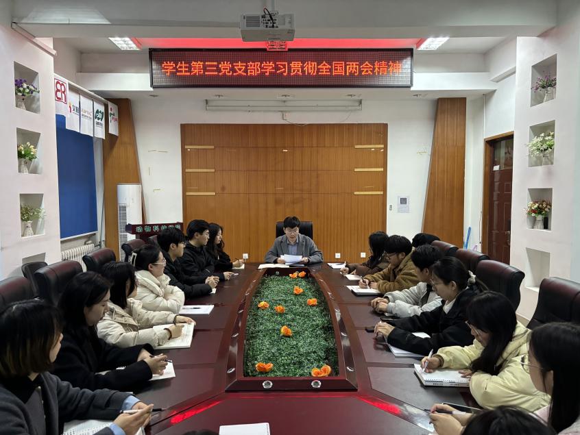 员工第三党支部书记于浪潮结合全国“两会”关键词开展学习贯彻两会精神专题学习会议。他要求支部上下要将两会精神与自身的学习与工作实际紧密结合起来,将其内化于心、外化于行,不断提升思想政治素质和实践能力。