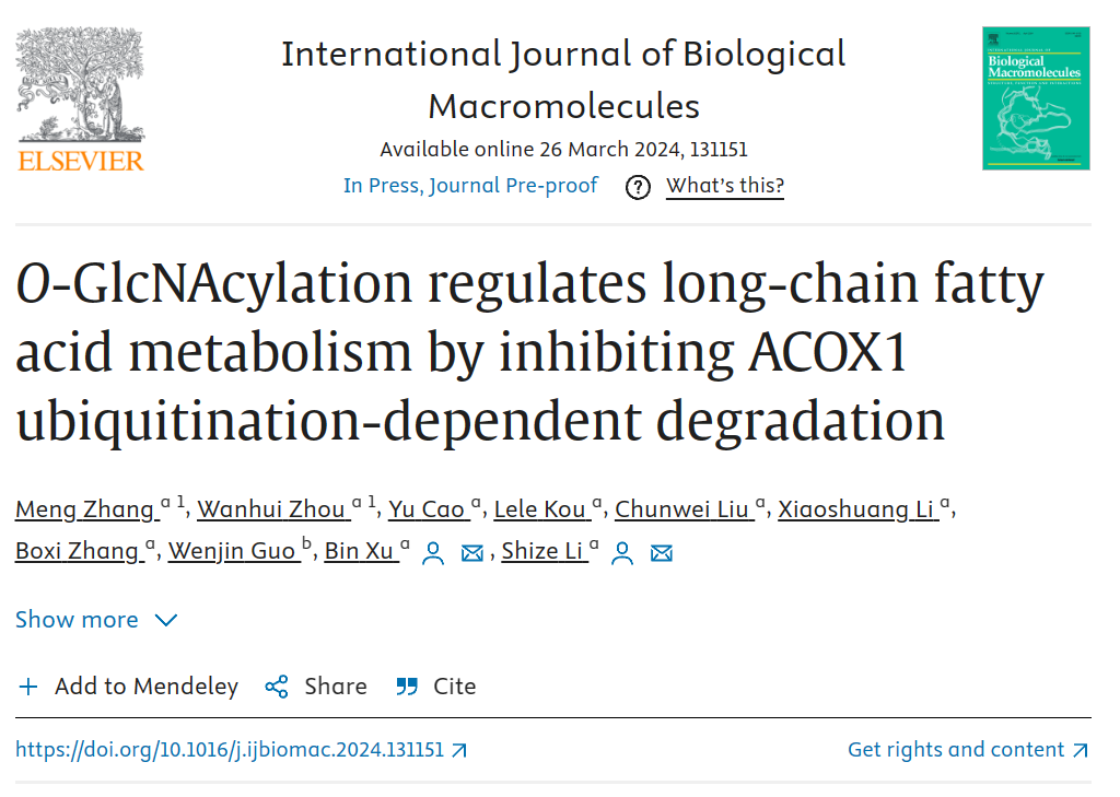 近日,公司动物应激生理学团队李士泽/徐彬课题组在一区权威杂志International Journal of Biological Macromolecules在线发表题为“O-GlcNAcylation regulates long-chain fatty acid metabolism by inhibiting ACOX1 ubiquitination-dependent degradation”的文章,发现寒冷加剧O-GlcNAcylation缺失诱导的脂质分解机制。