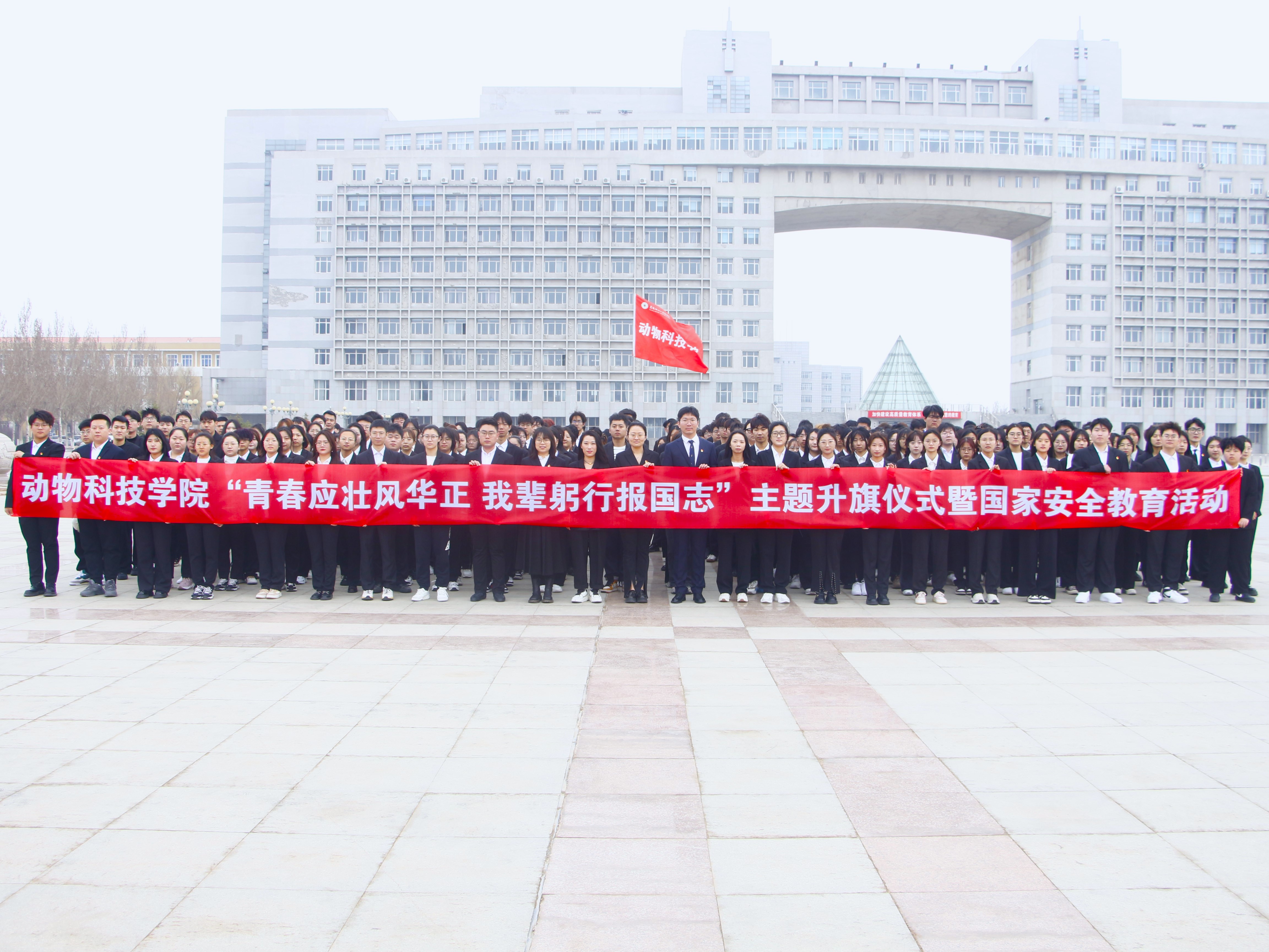 在全体师生的注目礼下,五星红旗冉冉升起,迎风飘扬。它代表着国家的尊严和荣誉,也寄托着动科学子对祖国的深情厚意。紧接着,校旗也在庄严的校歌声中缓缓升起,它见证了学校的发展历程,也激励着学院师生不断前行。