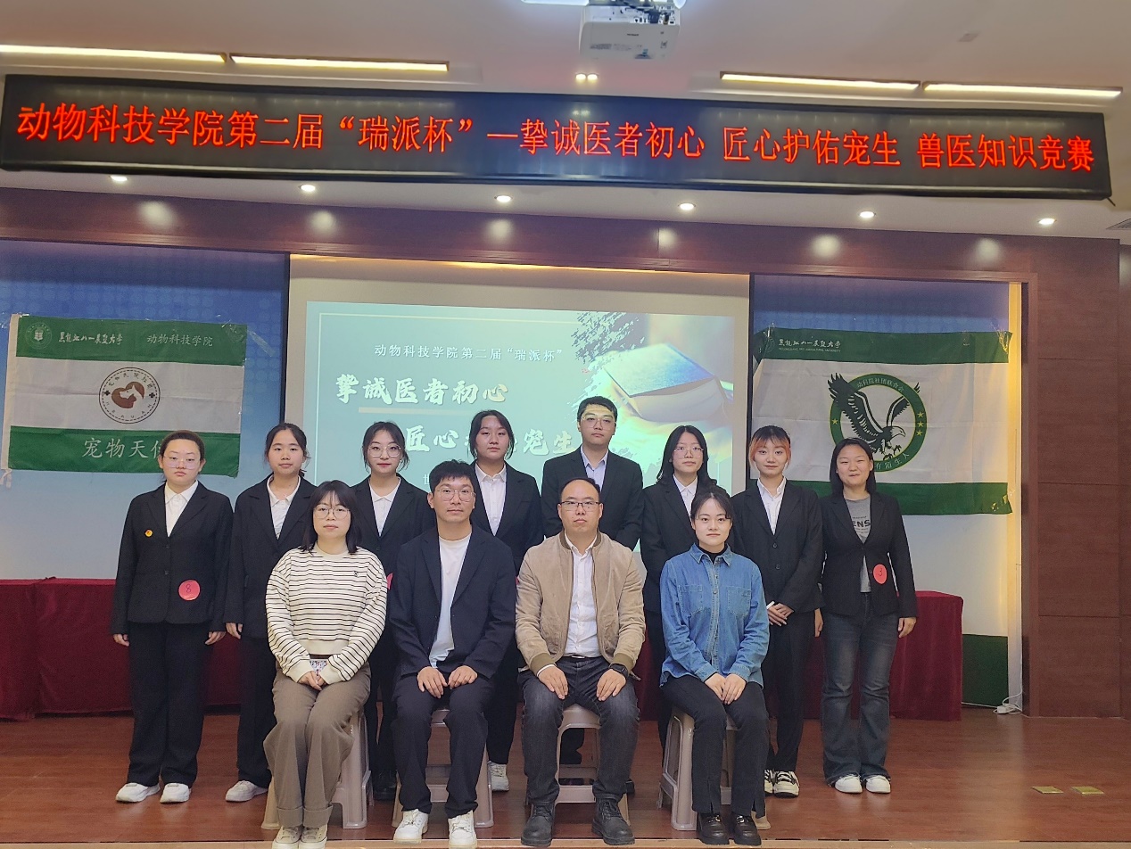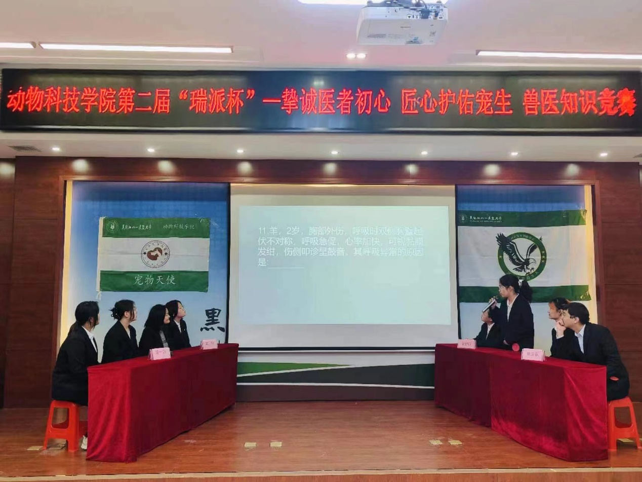 当日,学院还举办了第二届“瑞派杯”“挚诚医者初心 匠心护佑宠生”兽医知识竞赛决赛,旨在提升员工对兽医行业的认识,增强他们的专业素养,共80余人积极参加本次活动,学院辅导员应邀担任本次比赛的评委。比赛内容涵盖了兽医学各个领域,包括病理学、药理学、临床诊疗等。经过前期初赛、复赛的激烈角逐,最终有8位选手脱颖而出,进入决赛环节。决赛中选手们展现出了扎实的专业基础和出色的应变能力,经过现场3个环节的比拼,最终产生了本次比赛的获胜团队和最佳竞答个人奖。
