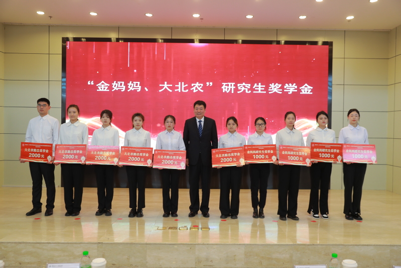 集团研究生与团队建设处处长杨克军为获得“金妈妈、大北农”奖学金的研究生颁奖。