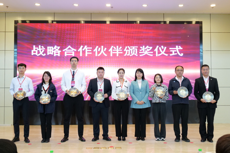 徐平为各企业代表颁发校企战略合作伙伴奖牌。
