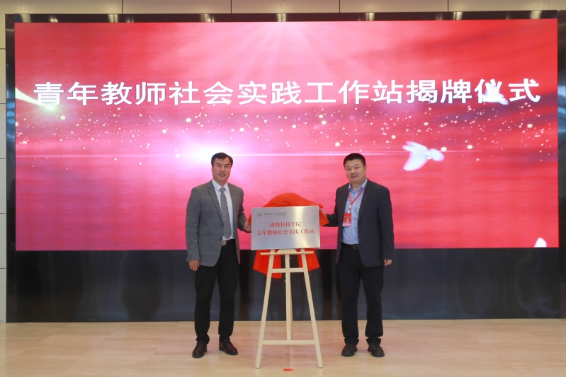 大庆银浪牧场有限公司一队党支部书记刘妍与学院教工第一党支部书记、“双带头人”党支部工作室负责人韩欢胜为双方党支部结对共建基地揭牌。