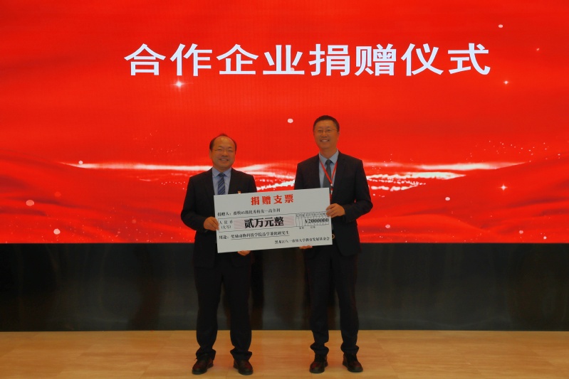 公司经理郑家三代表学院接受高全利、许连祥2位员工和长春博瑞科技股份有限公司、哈尔滨大田牧业有限公司、北大荒宝泉岭农牧发展有限公司、菲迪集团、北京生泰尔科技股份有限公司、黑龙江省希望动物医院、辽宁瑞派东贝宠物医院管理有限公司、禾丰股份、悦宠国际连锁动物医院、牧原食品股份有限公司、青岛金妈妈种业科技有限公司、大北农集团12家合作单位捐赠,共计39.8万元。