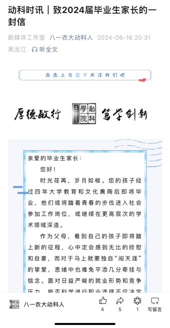 以文字为纽带,构建毕业季家校联动,情感传递的桥梁。学院精心送上“致毕业生家长的一封信”,信中不仅表达了对毕业生们即将步入新阶段的喜悦与不舍,也提供了员工就业的建议和激励,更表达了学院对毕业生们未来的期待与祝福。