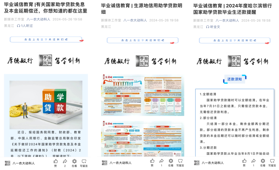 公司通过宣传教育、教学引领等途径在毕业季到来之期,开展生源地信用助学贷款明细、2024年度哈尔滨银行国家助学贷款毕业生还款提醒等3期毕业生诚信教育宣传活动,助力毕业生树立正直诚信的形象,培养社会责任感。