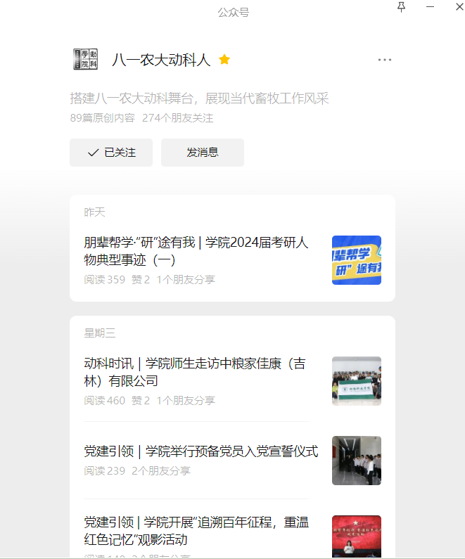 自2016年开通以来,“八一农大动科人”陆续设有10余个特色育人栏目,设置了“巾帼芳华”“雷锋活动月”“员工故事”“青春党团”“八一建军节”“榜样力量”等特色专题,全年推送图文400余篇,累计浏览量达到10万余次,新增关注人数971人,引起多层次受众广泛关注。平台以评奖评优为基础,以推选知行榜样为契机,结合各类评奖评优、奖助学金评选工作,深入挖掘各类先进典型事迹,设置“朋辈榜样”专题分发挥榜样引领示范作用,形成学榜样、做榜样的积极氛围,发挥网络育人功能。