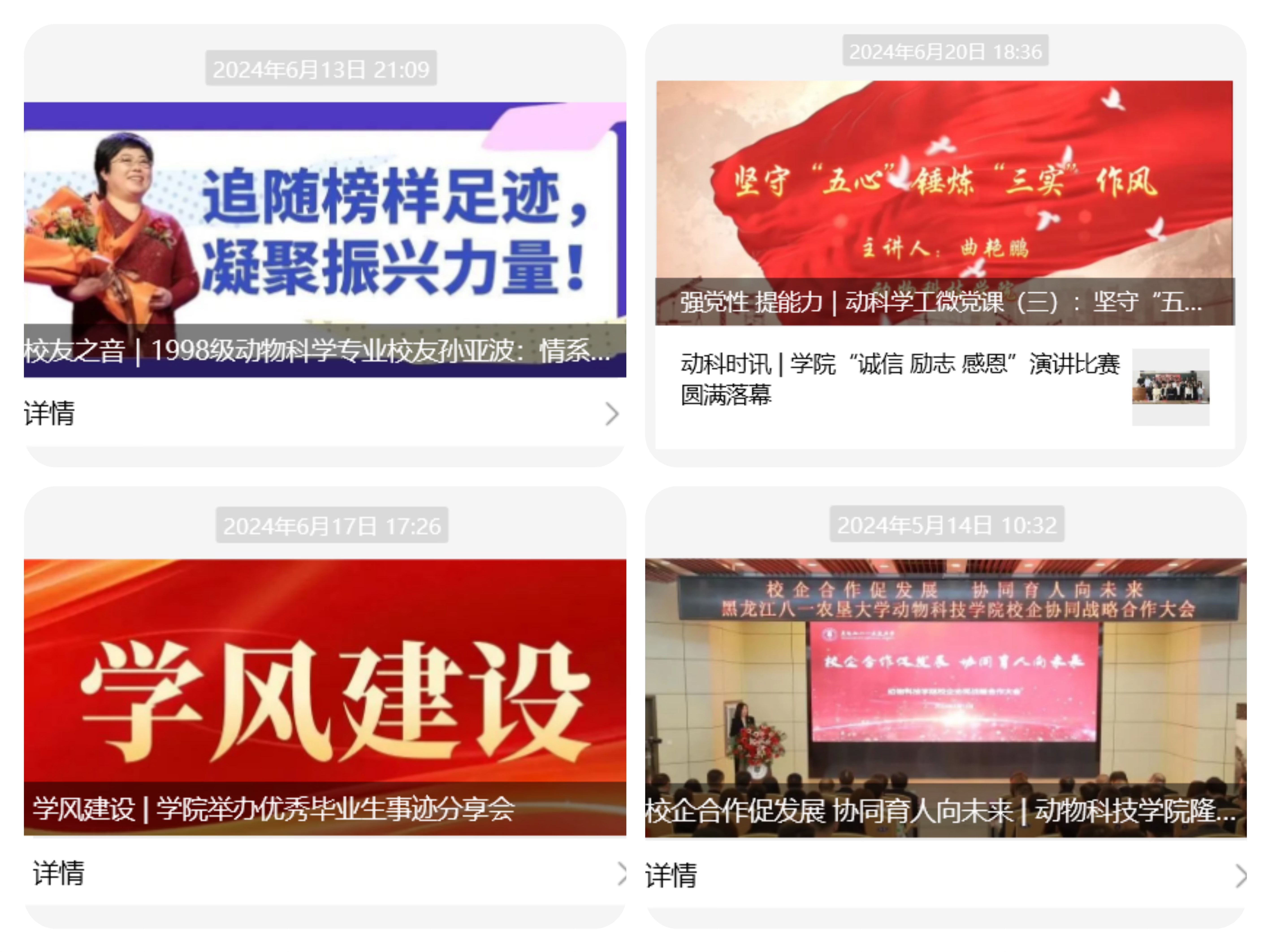 在“动科文化”主题下,学院开设《党建引领》《动科时讯》《走进动科》《动科速递》等专题栏目,并自主创作院训、院歌、院MV、动科小新等,让员工在潜移默化中感受动科文化,助力全员师生形成良好的精神源动力。