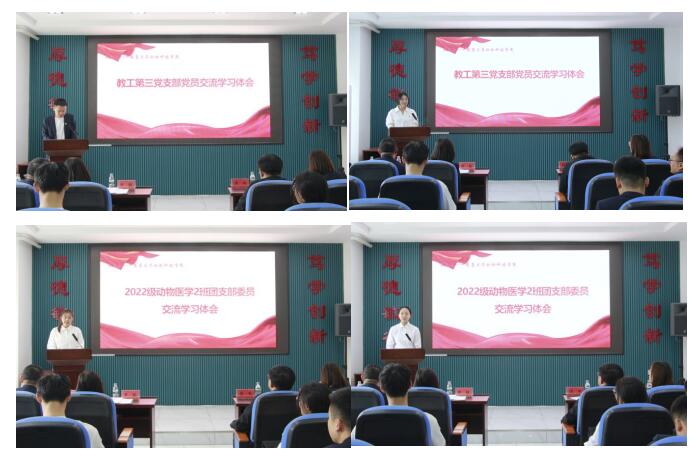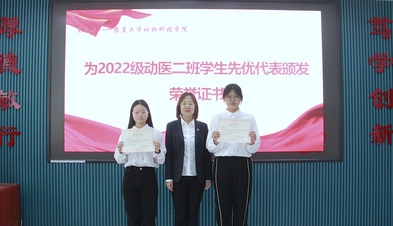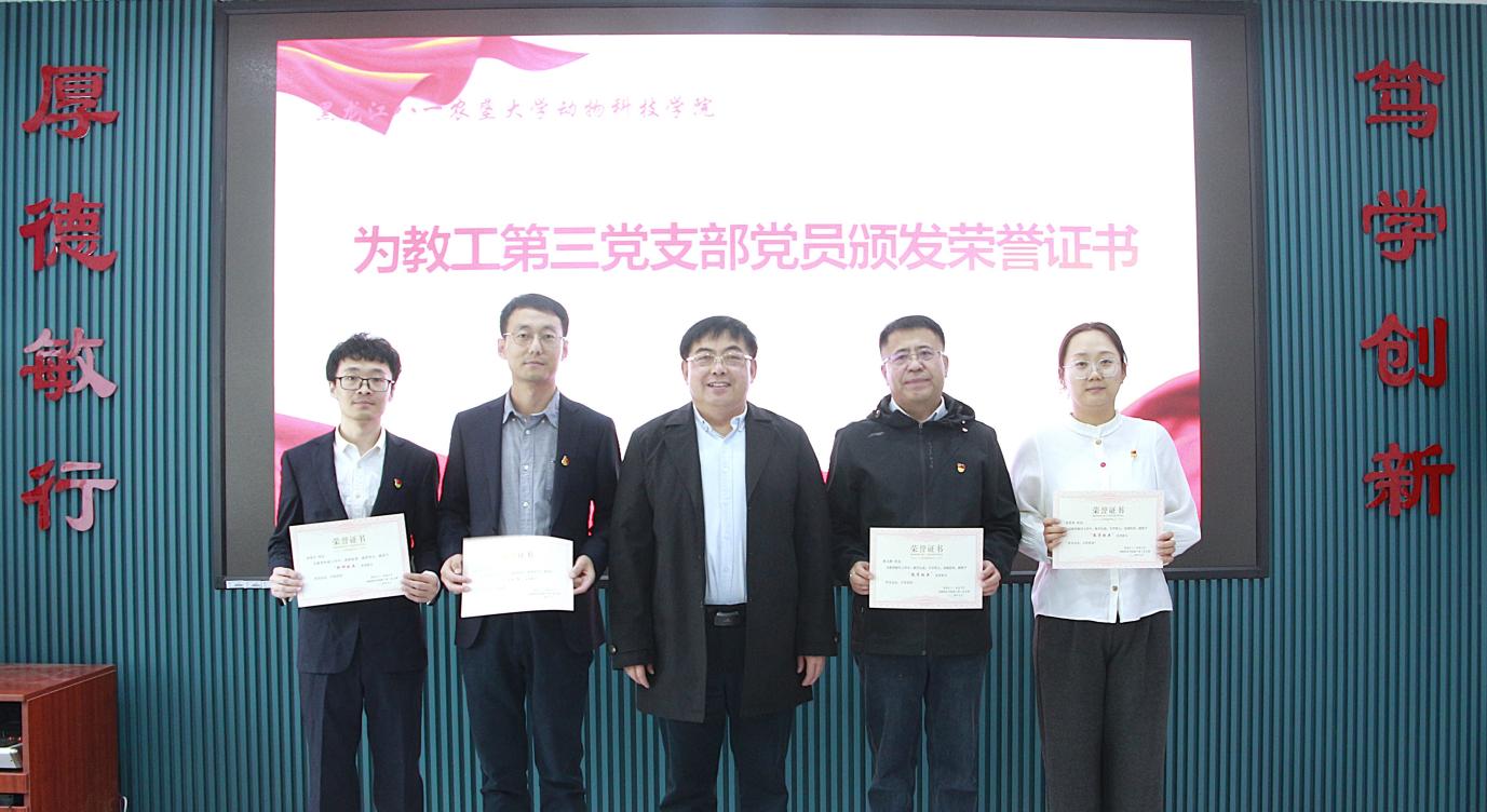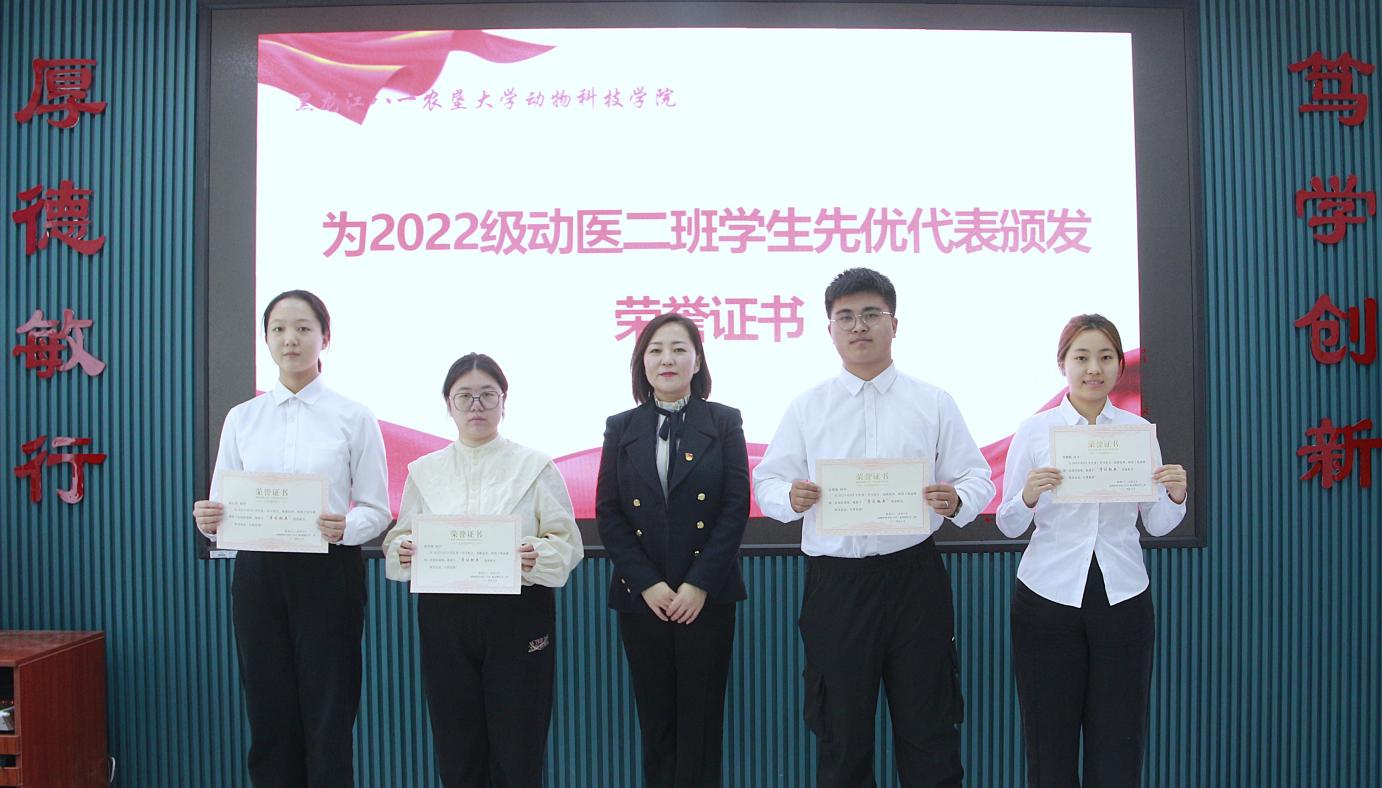 支部党员杨丹、宋玉溪、2022级动物医学2班马仪文、张馨聪分别结合工作和学习实际,交流了学习体会。孙旭东介绍了上一年度支部党员在科研、教学、社会服务、指导员工等方面取得的成绩,2022级动医2班班主任王建发介绍了上一年度班级员工在外语四六级考试、学习、班级建设等方面取得的成绩,与会领导分别为班级通过外语四、六级的“外语学习标兵”、综合测评和纯成绩前3名的“学习标兵”、党支部“科研标兵”“教学标兵”和“社会服务标兵”颁发荣誉证书。