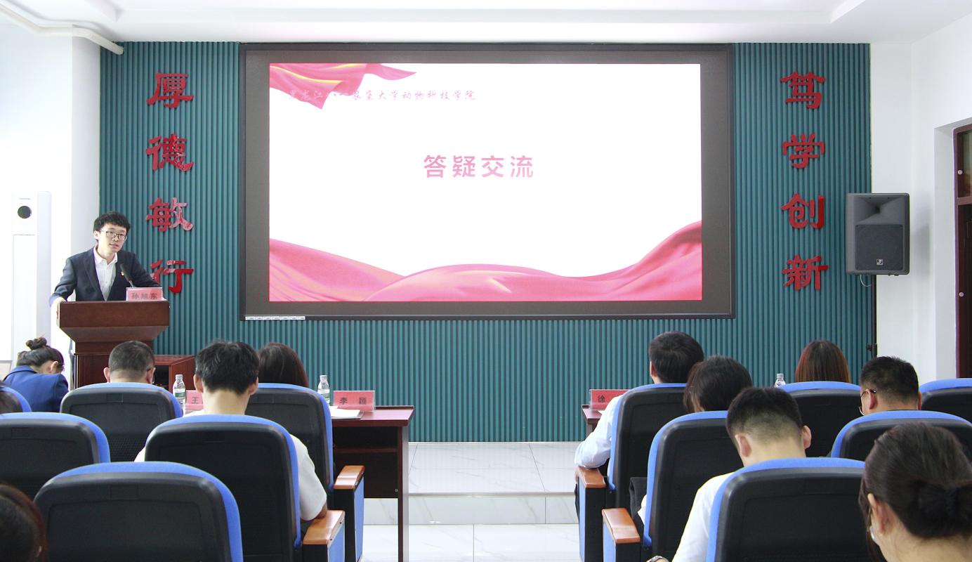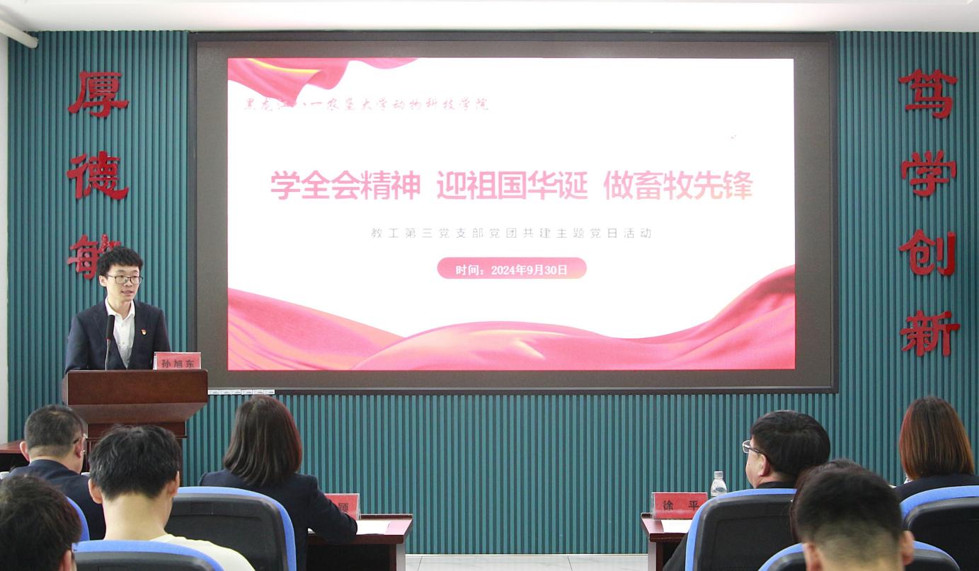 孙旭东作了党的二十届三中全会精神主题宣讲,解读了二十届三中全会精神和重大意义,分析了在新时代背景下,畜牧行业的重要性和面临的挑战,并分析了高校教师面临的机遇和挑战以及未来的努力方向。