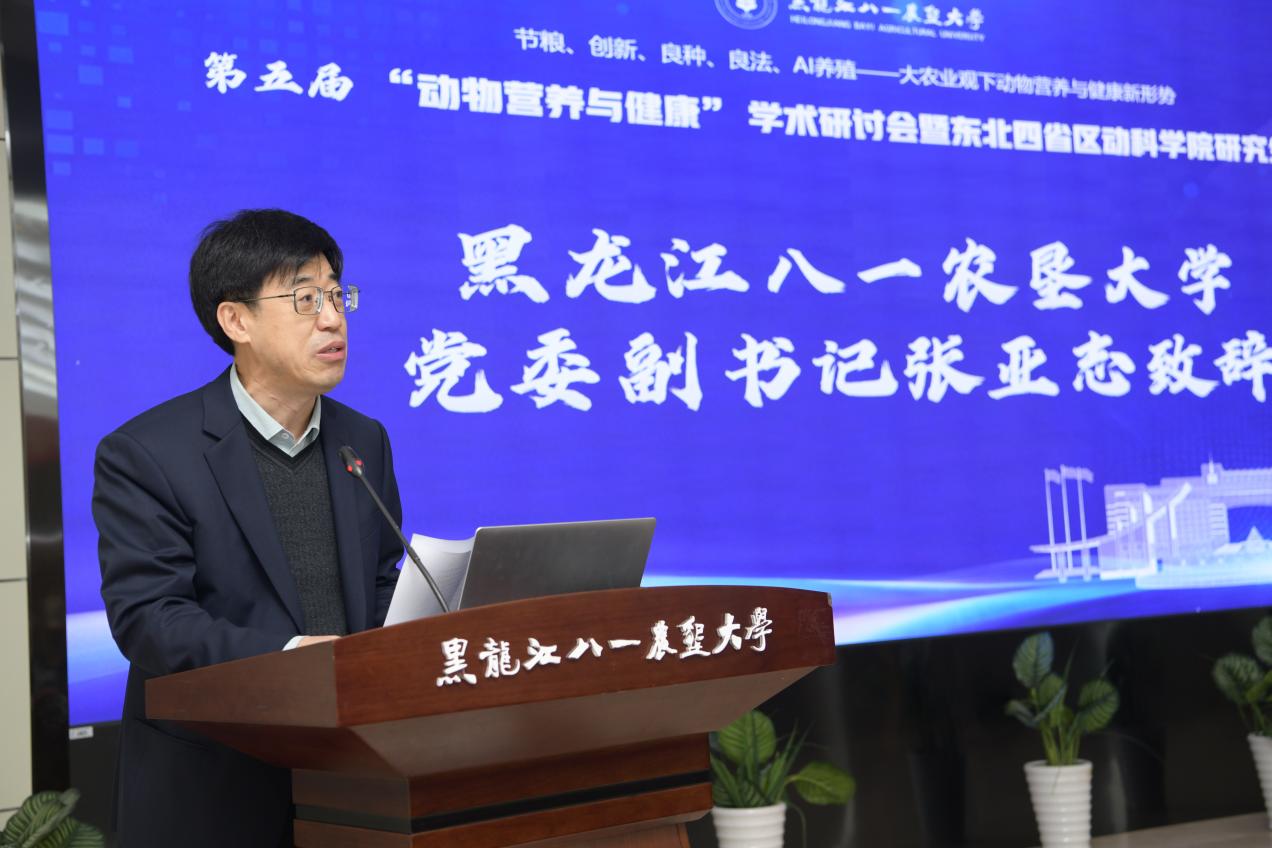 公司党委副书记张亚志代表学校向与会各位专家学者表示热烈欢迎,并向支持学校发展的兄弟院校和企业表示感谢。张亚志表示,动物营养与健康是畜牧业高质量发展的核心,关乎“大食物观”的践行与养殖业节粮增效目标的实现。本次学术会议是东北四省区动科学院积极响应党中央关于保障国家粮食安全、发展新质生产力战略部署的具体行动。他强调,八一农大始终秉持“立德树人、强农兴农”的使命,在动物营养、饲料科学、健康养殖、疾病防控等领域形成了自身的特色和优势。希望通过组织学术会议,聚焦学科前沿信息和畜牧生产中存在的热点问题,进行思想碰撞、智慧交流、成果分享,为推动东北四省区畜牧业科技进步和产业高质量发展作出更大的贡献。最后,他寄语广大研究生珍惜平台、勇于展示,将个人学术追求融入强国兴农的伟大事业,为推动东北地区畜牧业科技进步和产业健康发展贡献青春力量。
