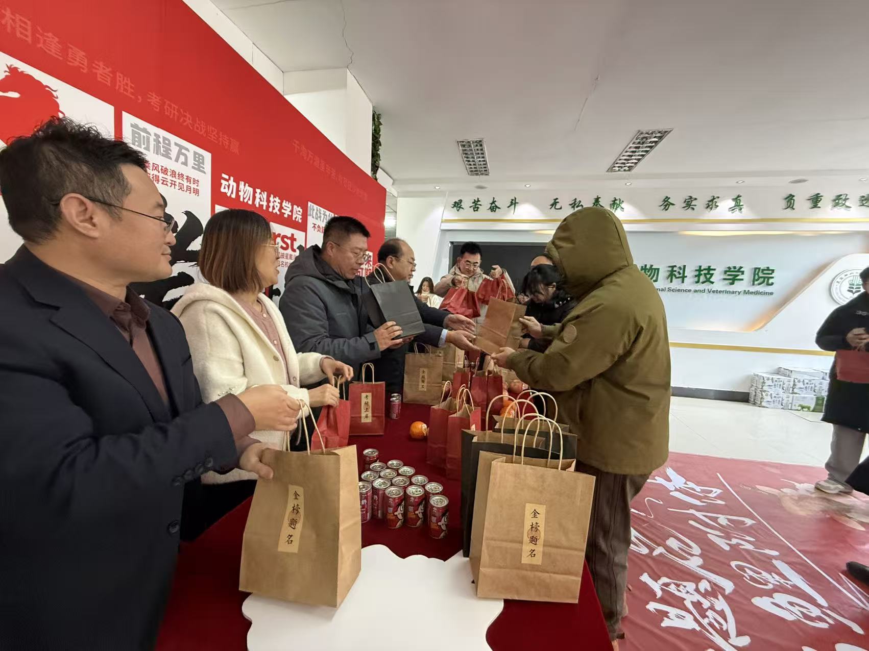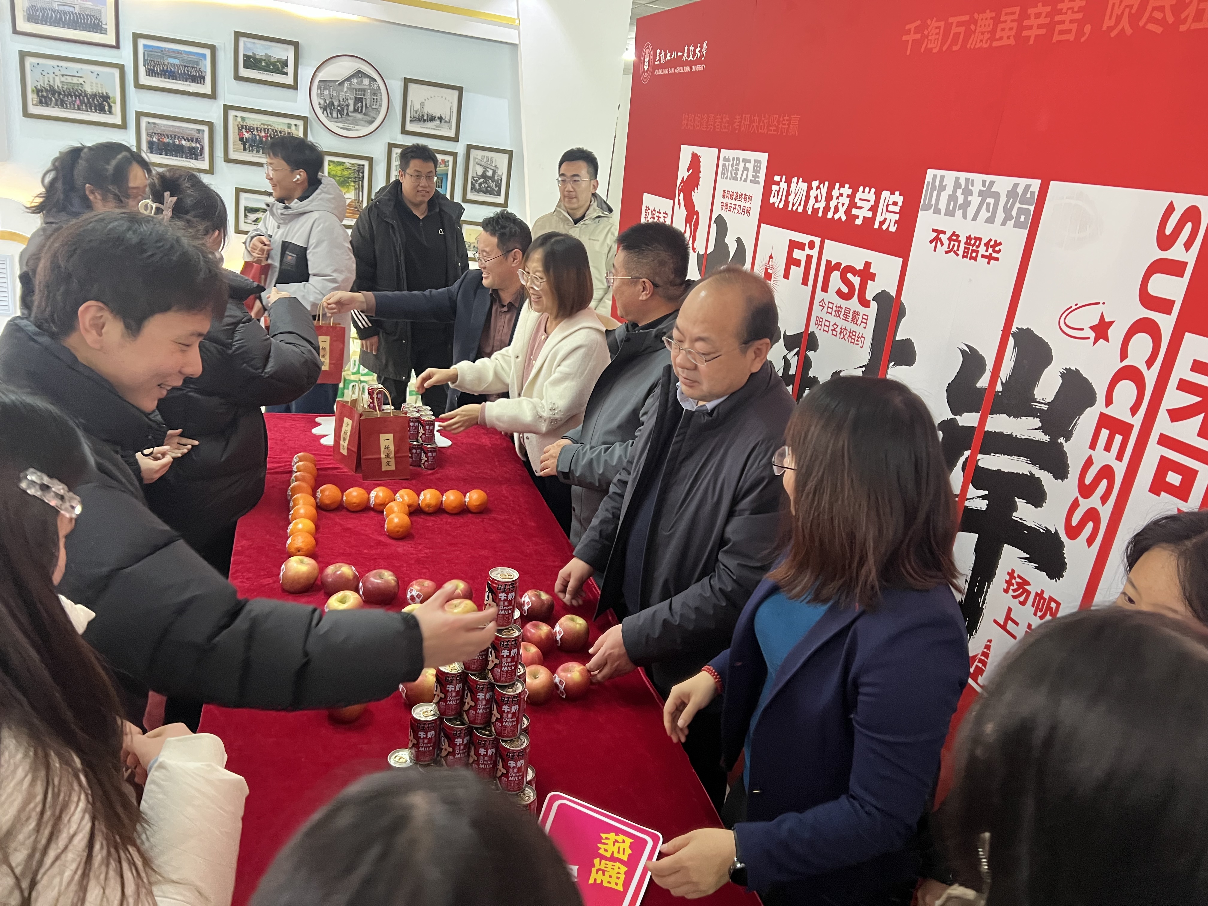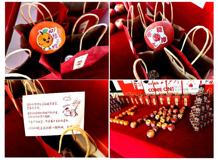 公司高度重视此次活动,精心策划并准备了承载满满心意的祝福锦“礼”包。礼包内不仅有饱含师生深情的祝福卡,更搭配了寓意美好的橙子、苹果与旺仔牛奶——苹果象征“苹”稳上岸,祝愿学子考场上沉着应变、稳定发挥;橙子寄托心想事“橙”的期许,盼学子旗开得胜、圆梦研途;旺仔牛奶则寓意好运连连。每一份礼品的寓意都经过字斟句酌,将学院的浓浓关切融入其中,为学子送去温暖与祝福。活动现场,整齐摆放的祝福锦“礼”包,成为冬日里最动人的风景。
